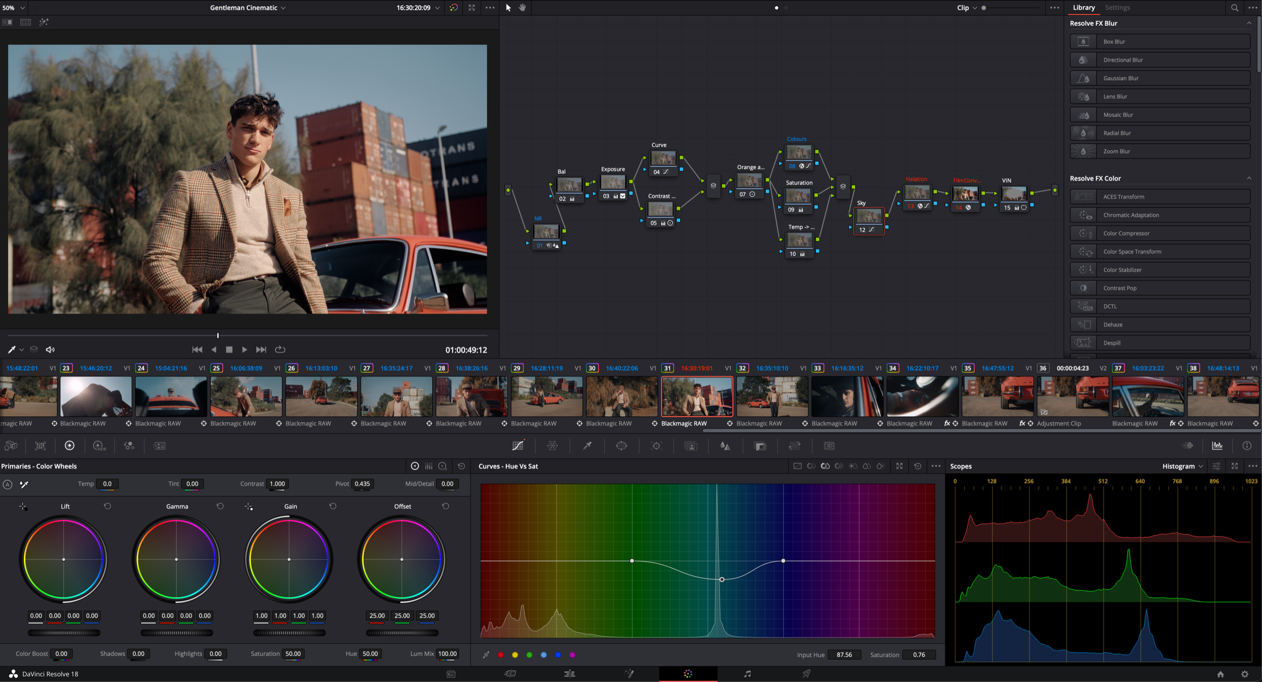 Lastly a couple of hue changes to the sky, and using power windows to brighten up my subject and certain parts of the frame, and voila! The final image was done, and could be applied consistency to most frames, with some clips requiring more attention than others, due to large changes in exposure between takes.